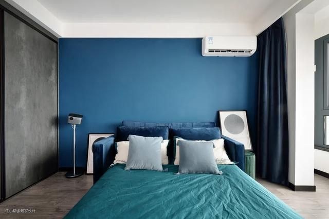 除了主卧之外的一间朝南房做成多功能房,拉下来是沙发床,观影、临时小住都可以,以后有了宝宝也比较方便改成儿童房。当时比较流行的颜色,雾霾蓝、孔雀绿、脏粉色、灰咖色等等,设计师朱志明就在流行色中提取了一些,形成不同空间的撞色。