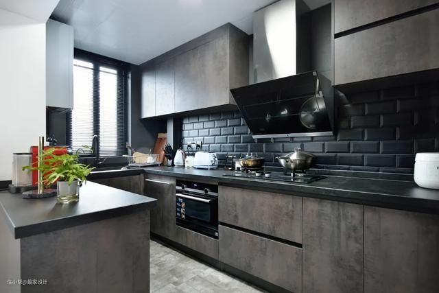 厨房里,好看又费力气的是现场砌的封釉水泥漆岛台,区别于很多带水槽、抽屉的中岛台,这个更加时尚。颜值高的岛台,施工更是难上加难。岛台切边口一定要量出横平竖直,厚了不好看,要单薄,可是薄了又怕承重有问题。师傅在岛台的局部插进钢筋,又在现场浇了一块非常薄的水泥板贴上去,再做加固。细节控设计师反复叮嘱:“上面细两边宽不好看!阳角一定要垂直!”在他的碎碎念中,长100cm、宽85cm、厚度8cm的高颜值岛台诞生了!就说这个功夫和颜值,给不给满分?