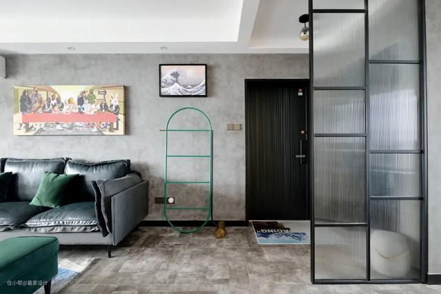 设计师朱志明希望在进门处就感受到家的时尚,长虹玻璃+黑框的隔断可以又潮又美的,磨砂玻璃可以隔一下视线,又不会造成进门的压抑。长虹玻璃比普通白玻璃大概贵50元/㎡,性价比很高的隔断。