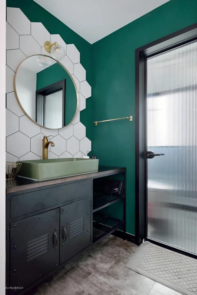 通常的干区一般都是满贴瓷砖,潮男设计师怎么会陷入老套呢?他选择了蜂窝状的六角砖,只贴一大半,让墙面的整体有种缺失感。提出表扬的是,设计师能让工业的做旧效果,看起来是时尚而不是旧房子的感觉。配色特别选择了孔雀绿,金色五金加上黑色台盆柜,高级感的黑配金,想不好看都很难。颜值满分、实用满分!