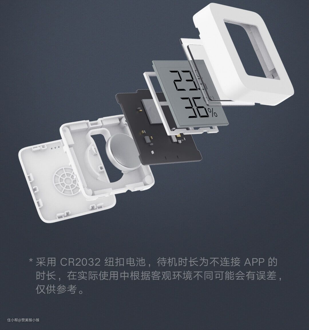在功耗上采用一颗7号电池供电,可以待机一年时间。通讯协议上采用了蓝牙协议,可接入小米智能音箱的蓝牙mesh网关进行温湿度数据远程查看和智能联动。