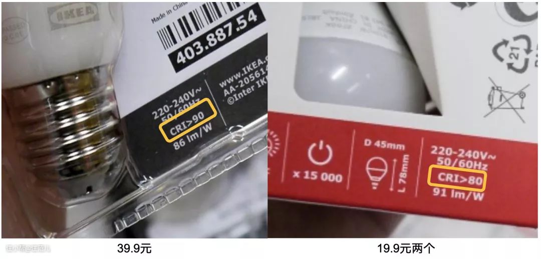 便宜都是有原因的,比如芯片便宜,比如显色指数低……看下宜家这个灯泡,价格差就在显色指数上。