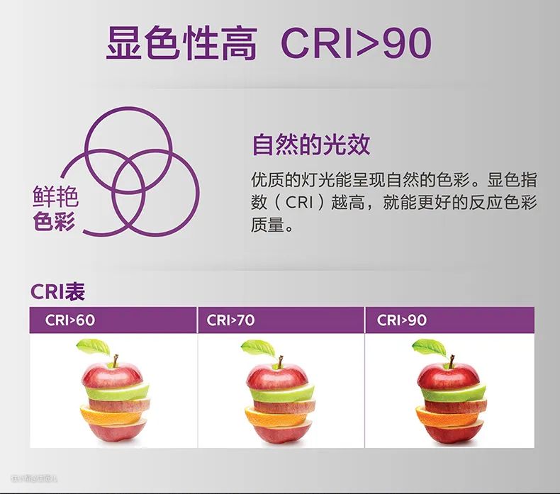 自然光的显色指数是100,所有的颜色都齐全、饱满,人造光的显色指数,越接近100越好。