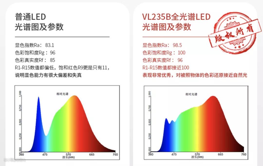 但是LED在色彩呈现上有短板,比如RA指数是R1-R8的平均值,不包括“饱和红”,很多LED灯的饱和红R9指数是负数……
