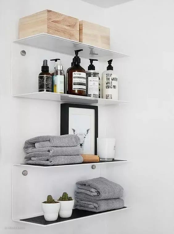 当浴室的洗护用品无处安放时,墙面置物架就是一个很好的收纳地。