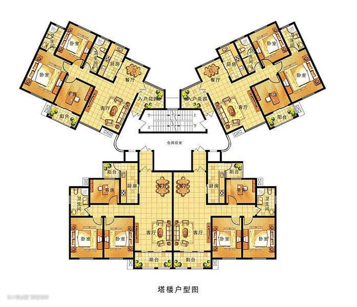 塔楼平面图特点:一般多由四五户共同围绕或者环绕一组公共竖向交通形成的楼房,平面的长度和宽度大致相同。