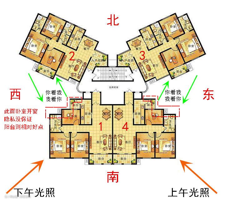 从下面塔楼的平面可以明显看到,1号可以和2号对望,而3号则和4号对望,隐私比较不好。