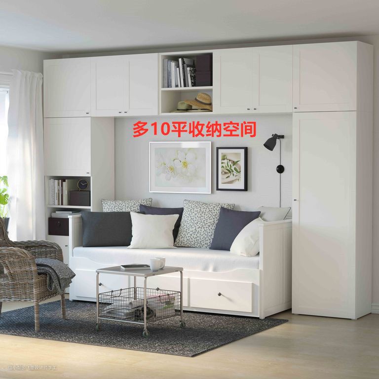 小户型教科书式收纳,围着沙发做一圈n字型柜子,多10㎡收纳空间