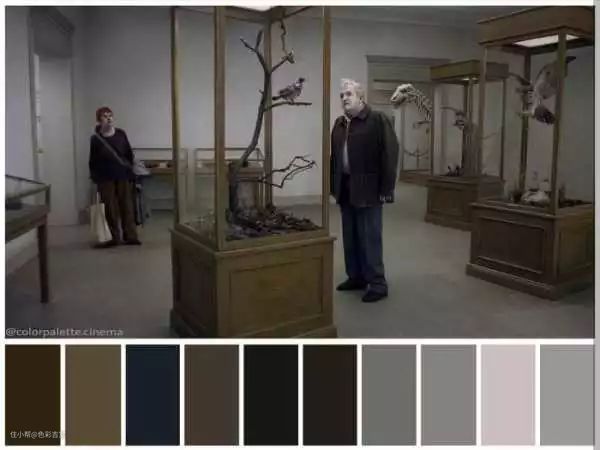 导演罗伊·安德森的作品采用低饱和度,用灰调子表现出一种更模糊、更清冷、远离灿烂,而得到的温和色系。尽可能少的色彩对比,模糊到甚至看不清道具与人物的影子,从配色中就能看出其故事的悲喜杂糅的隐忍效果。