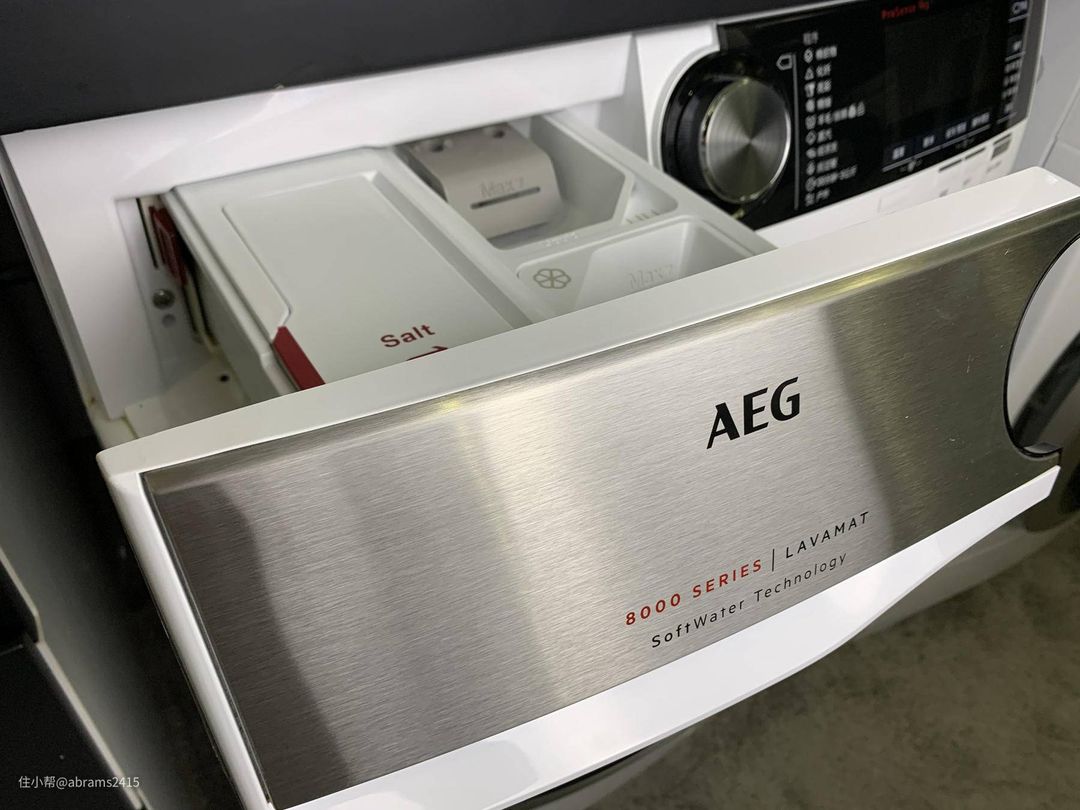 ▲这款AEG 8000系列9公斤洗衣机顶部操作区采用不锈钢控制面板,优质金属镀层旋钮,德式对称设计,质感与科技感相结合。SoftWater Technology logo是我们入手这款的最大因素