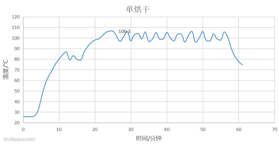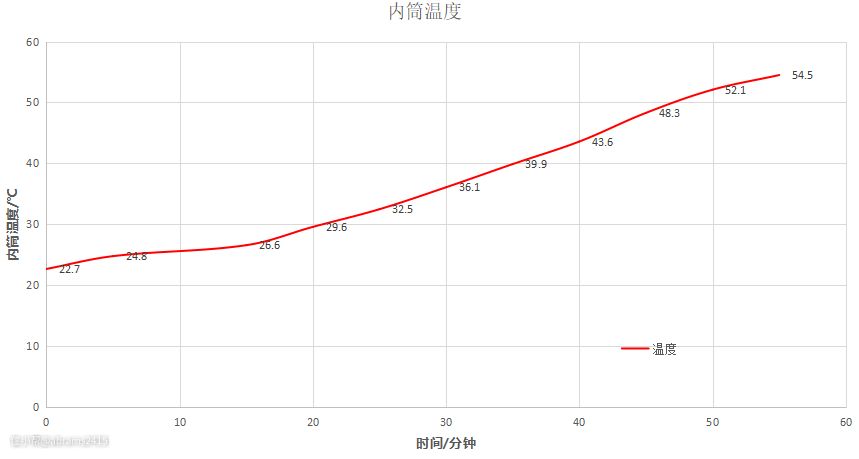 ▲这是我实测的某款热泵烘干机内筒温度变化曲线,可以看到烘干最高温度在54.5℃左右。