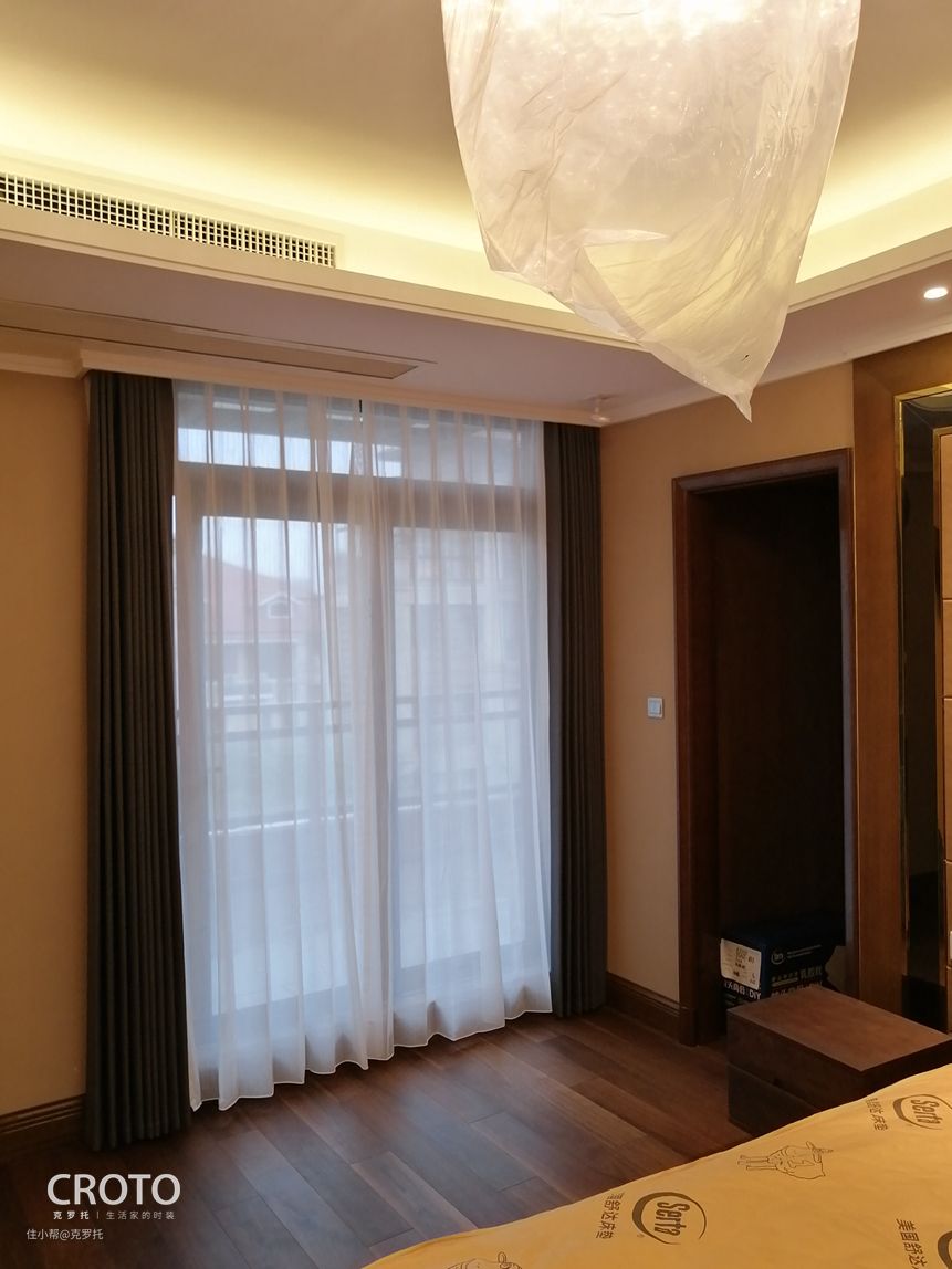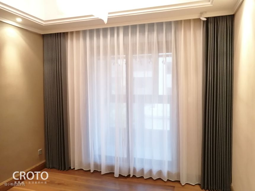 图四、五、六的卧室空间,窗帘的使用选择了不会出错的百搭灰色,稳重简约,淡淡的暗肌理纹路体现着中式的古朴,灰色又提升了空间的时尚气息,使整个空间,传统中透着现代,现代中揉着古典。