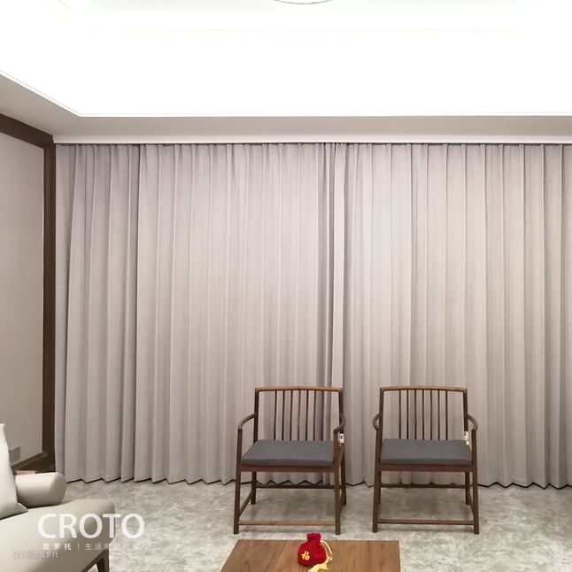 图一、二、三的客厅空间,在窗帘颜色搭配的选择上选择了与墙面颜色一致的浅暖色调,整体空间颜色干净素雅,显得格外协调,羊绒质感的面料为中式风格家装增添了温暖的格调。