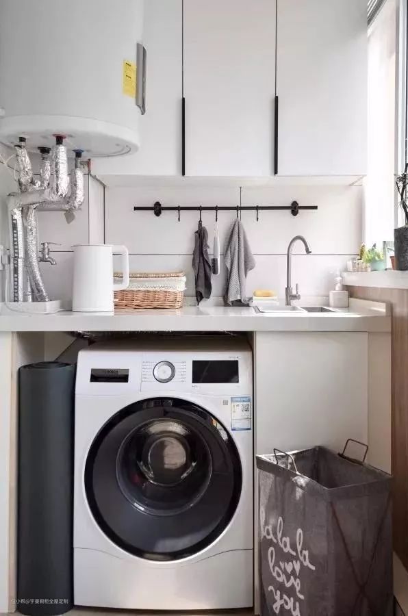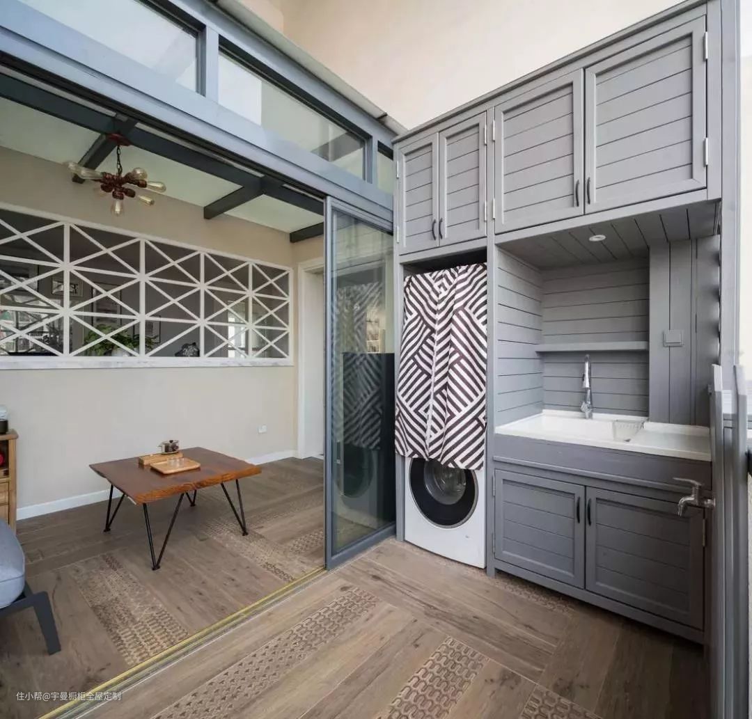 宽度较窄的阳台,最适合设计吊柜做储物,下方留出空间摆放洗衣机。阳台宽度足够时,可以打造阳台柜+洗衣机+洗手盆或是洗衣机+立体柜的组合设计,搭配开放储物格,最大化利用空间,方便生活!▼