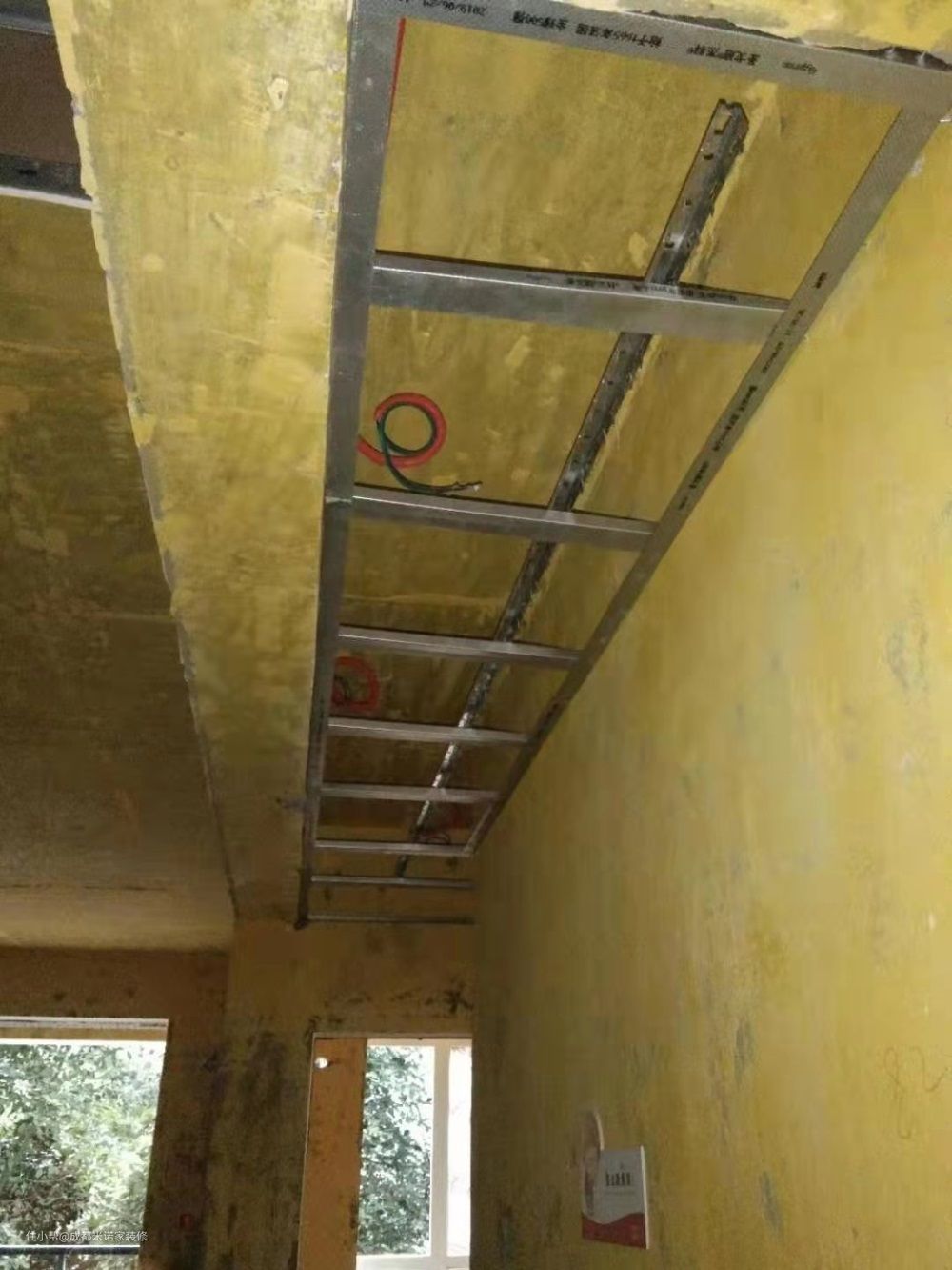 1、吊顶采用全轻钢龙骨施工工艺,在铺设龙骨时,吊丝、主辅龙骨连接的间距严格按照施工标准安装,保障骨架的连接密度,确保吊顶基架的稳定、坚固。