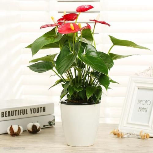 红掌,又叫花烛,它花叶俱美,花姿奇特美丽,花期长。家里养一盆红掌,象征着日子越过越红火,红色的花骨朵上面嵌着一个金色的花穗,这也是招财的意思。