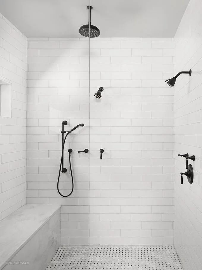 大气的双开门淋浴房,白色的面包砖、黑色的细框玻璃门,非常北欧的一款淋浴房。但不用于别人家的石凳子,这里做了一款大理石三角面,似有似无的存在。