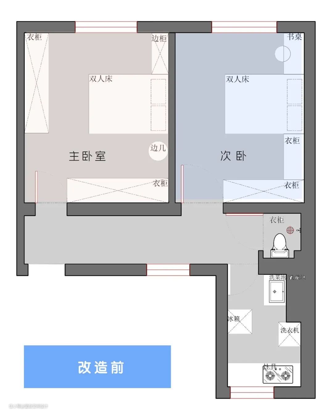 我们再来看第二个案例,这是一个我们正在装修的业主家,下图是改造之前的户型图,典型的手枪户型。因为是以前的老房,没有客厅。两个卧室的布局不合理,空间利用率低,很多地方都被浪费了。