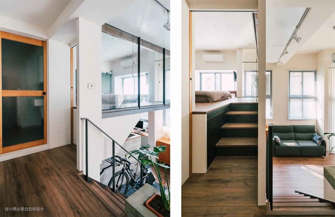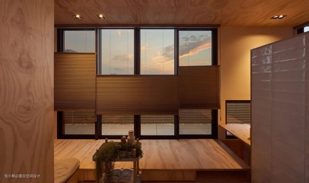 百叶帘也不错,下面这个设计也是来自于台湾的一个设计团队,从台阶上来之后就可以看到床,确切的说,是床垫。