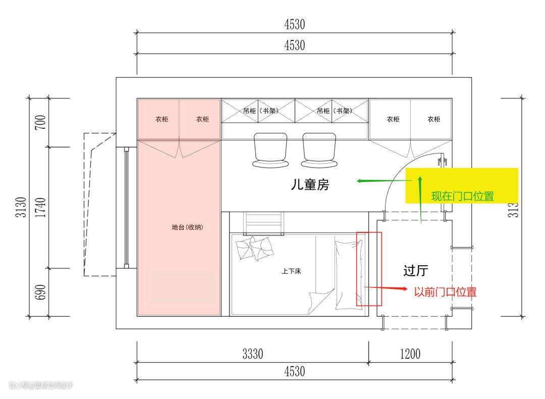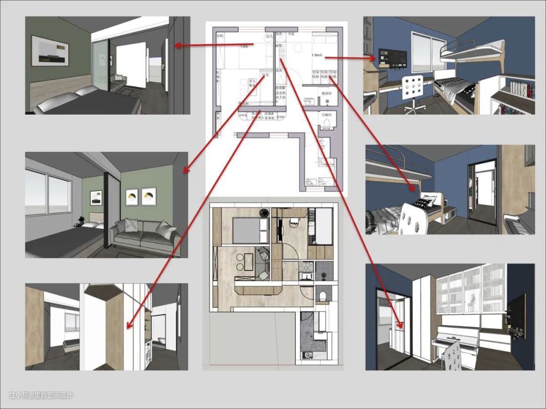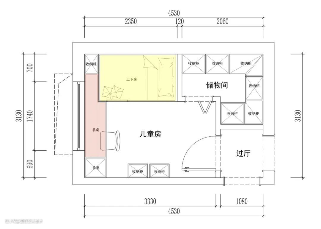看红线框出来的这间卧室,它的原始问题是:房型不规整(有凹凸角),空间利用率极其低。假设这间小卧室要住两个孩子呢?