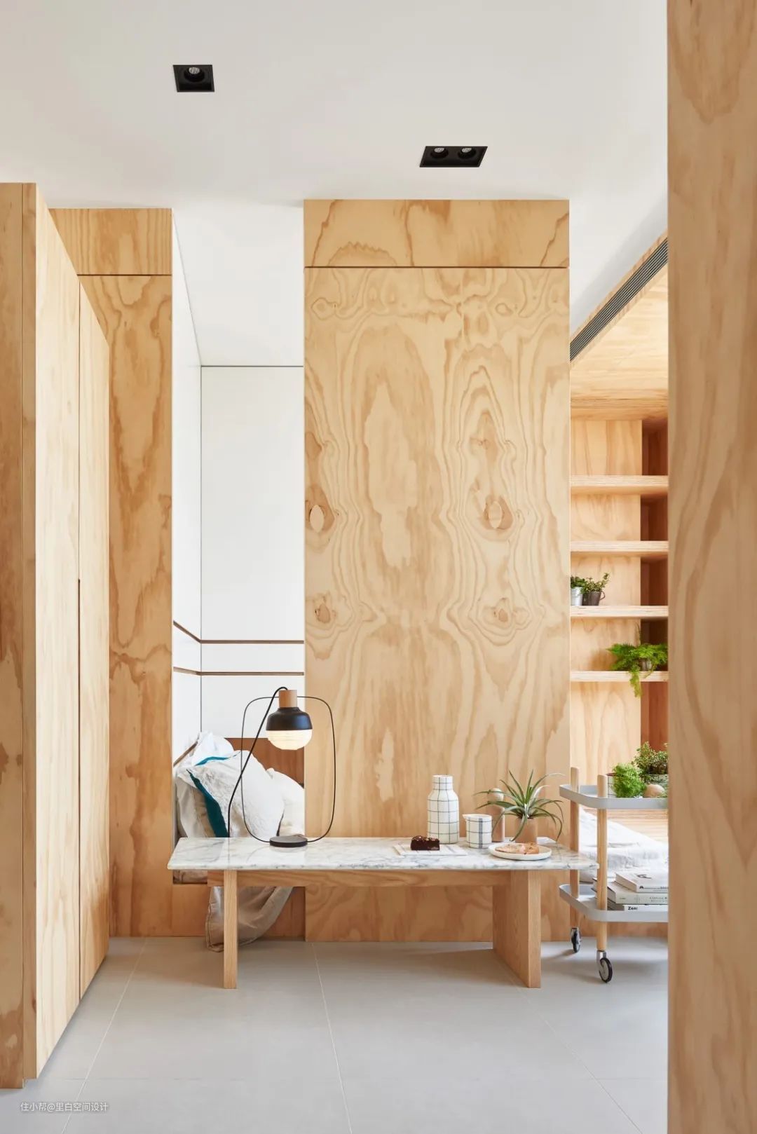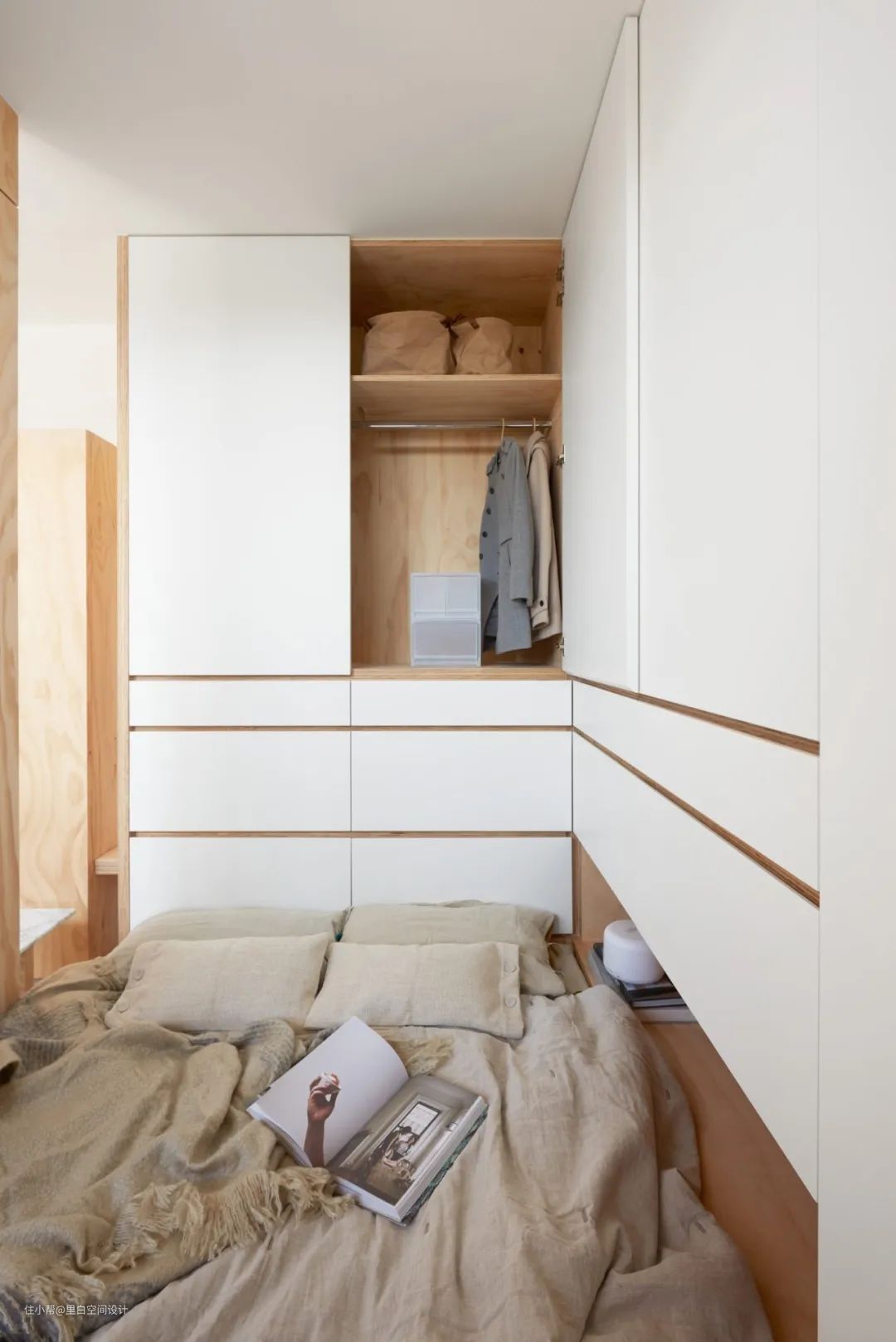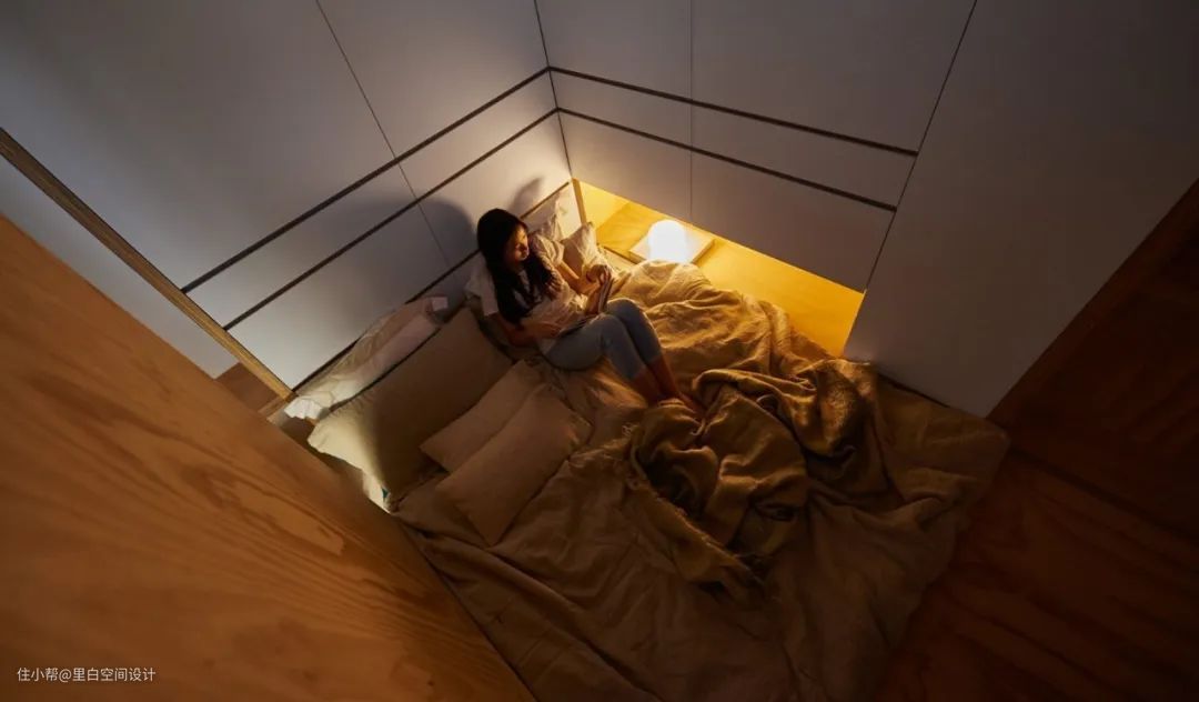 她获得红点奖的一个作品,全屋只有28平米,地台式的床,下面可以简单储物。床的一侧是木板隔断,另一侧是收纳柜,加了壁龛,相当于床头柜的作用。床头靠背是衣柜,不会冰冷。