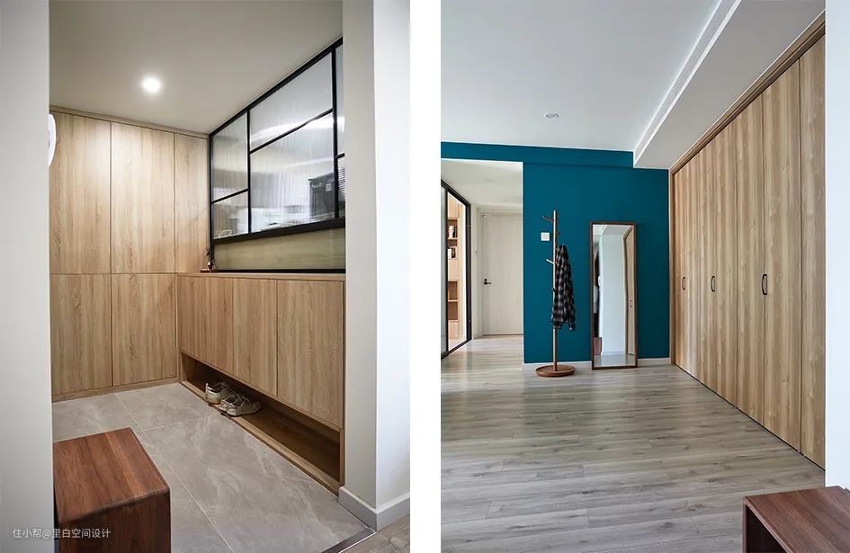 收纳从主卧室转移到了其他空间,玄关、走廊和客厅,只保留了一个衣柜,这样住在6平的室内也不会因生活物品超载而感到压抑。