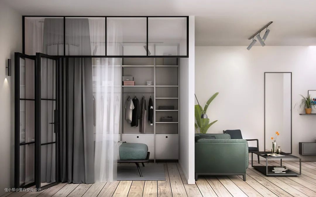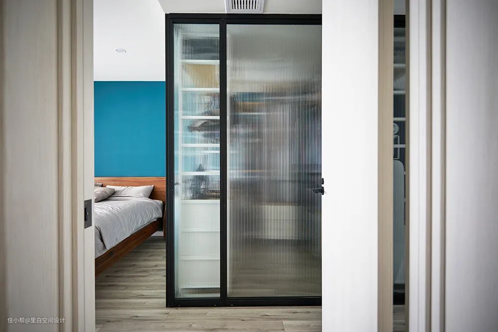 卧室衣柜如果是平开门,需要开门空间,推拉门的轨道又会占用衣柜厚度。所以,还有一种办法是侧墙的衣柜可以用百叶风琴帘取代传统柜门,为卧室节省不少空间。
