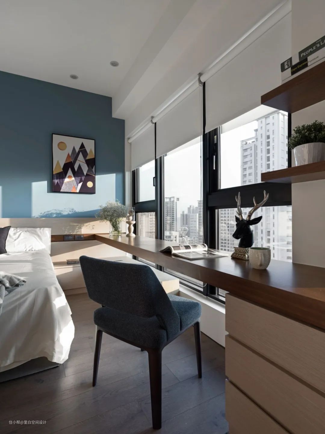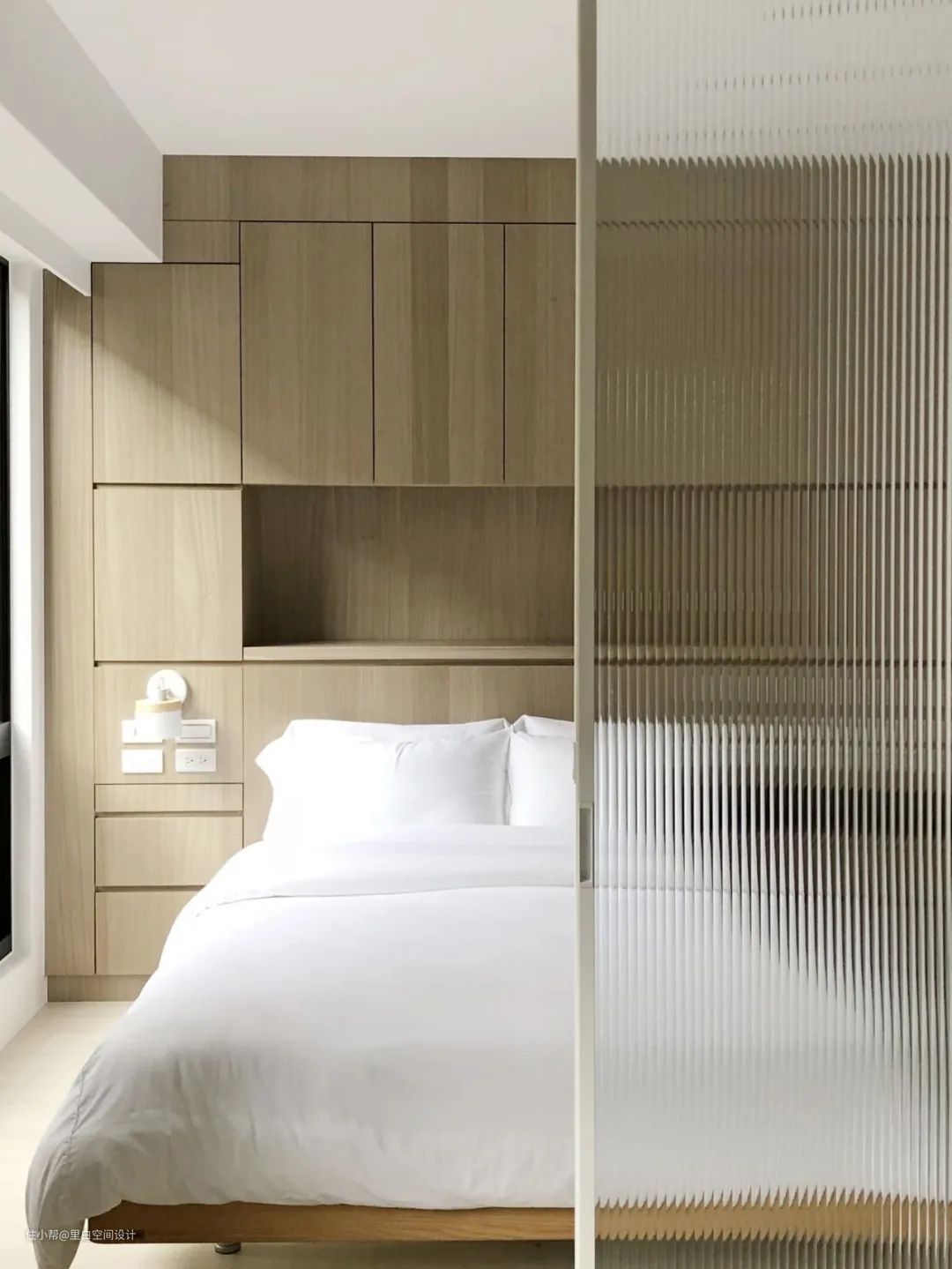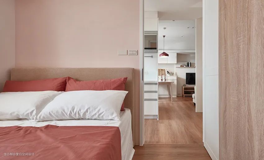 除了传统的摆放方式之外,像这样床的宽度和卧室墙完美契合,「刚刚好」的距离也可以省下空间。