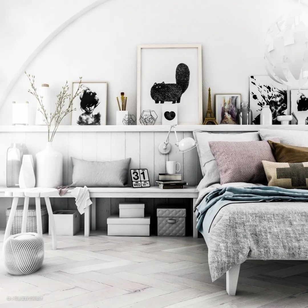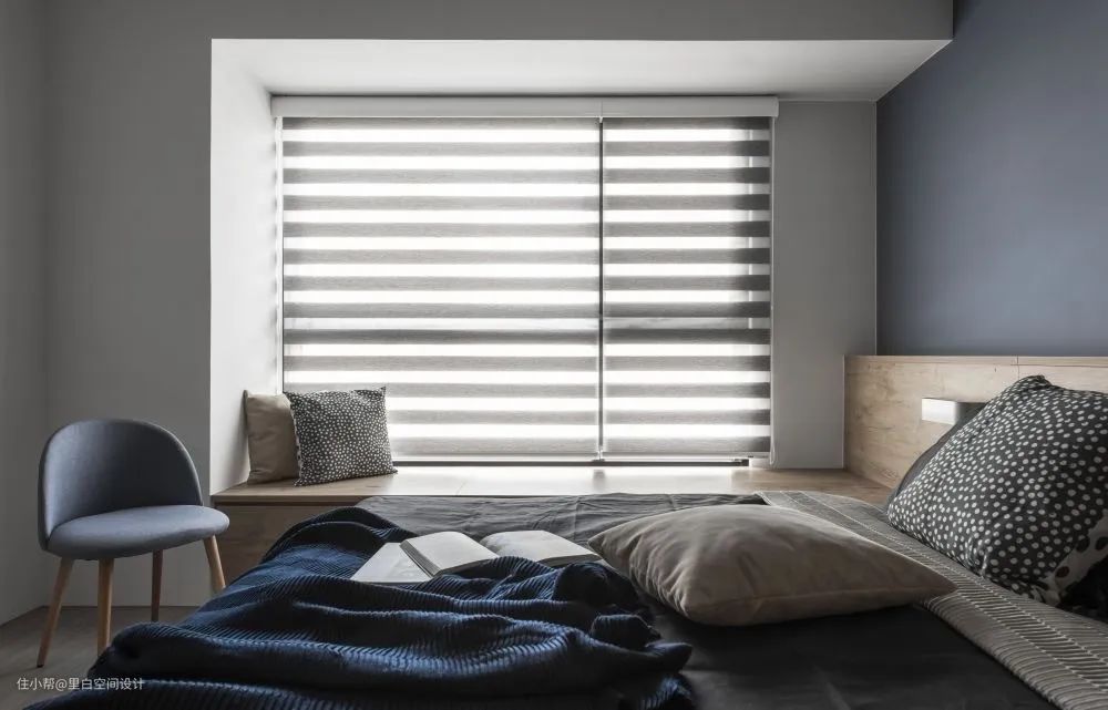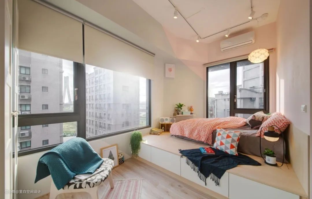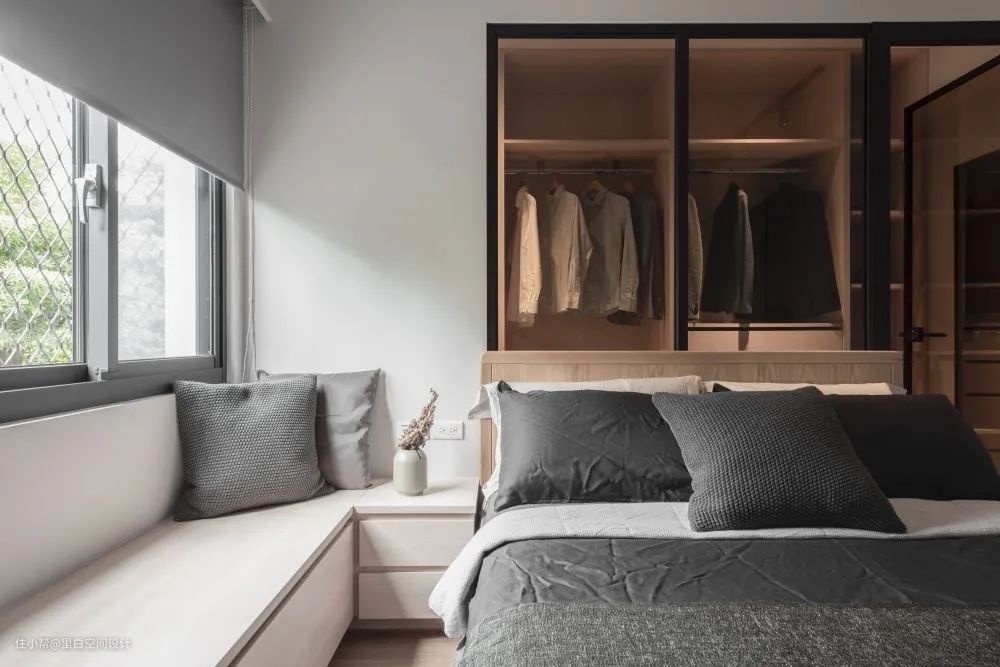 对于小卧室来说,卧榻很容易变得鸡肋,想小有情调的喝喝咖啡跟小酒,晒晒太阳读读书,可是最后发现这个地方基本上会变成临时收纳区,严重影响家里的颜值。还不如利用起来,让它既可以收纳,又能坐人,同时充当一下床头柜的角色。