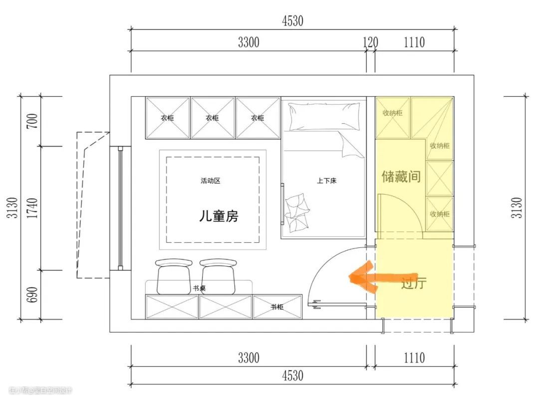 将原来房间凹进去的部分外扩,缩减卧室B的面积,把这个区域做成独立的储藏间,解决衣物、玩具等收纳问题。设计长1200mm,宽2000mm的上下床保证两个小孩可同时使用。