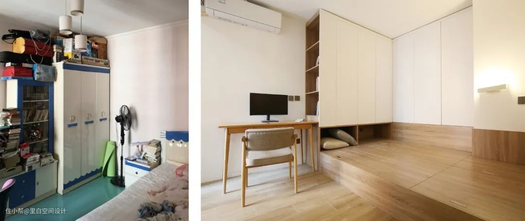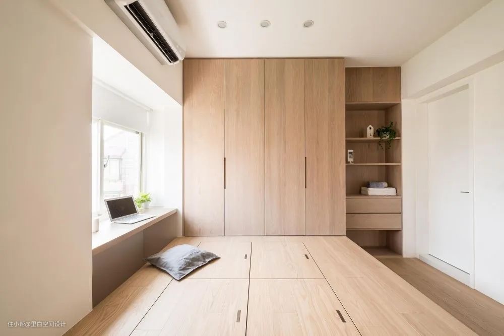 所以,我们把原来的床位设计成榻榻米样式。不仅增添了储物空间,它也从一个功能单一的次卧升级为多功能室。