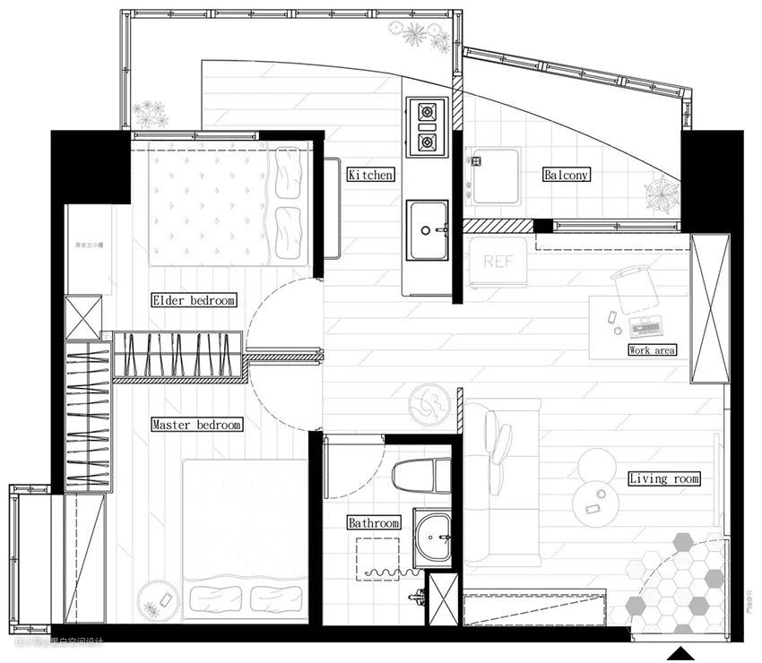 台湾获奖无数的设计师黄铃芳,在她最初的小户型设计中,经常能看到地台床;比如在下面这个设计里,儿童房采用长条布局,靠近房门处被设计成衣帽间,另一边为地台。