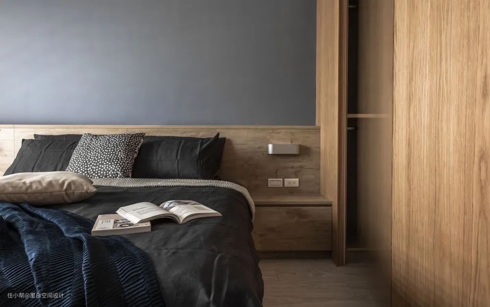 而且像下面这样,利用樑柱下方来做柜子,不仅解决了收纳,也能化解风水问题。无需再买床头柜,省钱省空间。