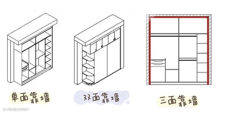 一般衣柜有三种摆放方式:单面靠墙、两面靠墙和三面靠墙,也是根据每个家庭的不同选择摆放方式。