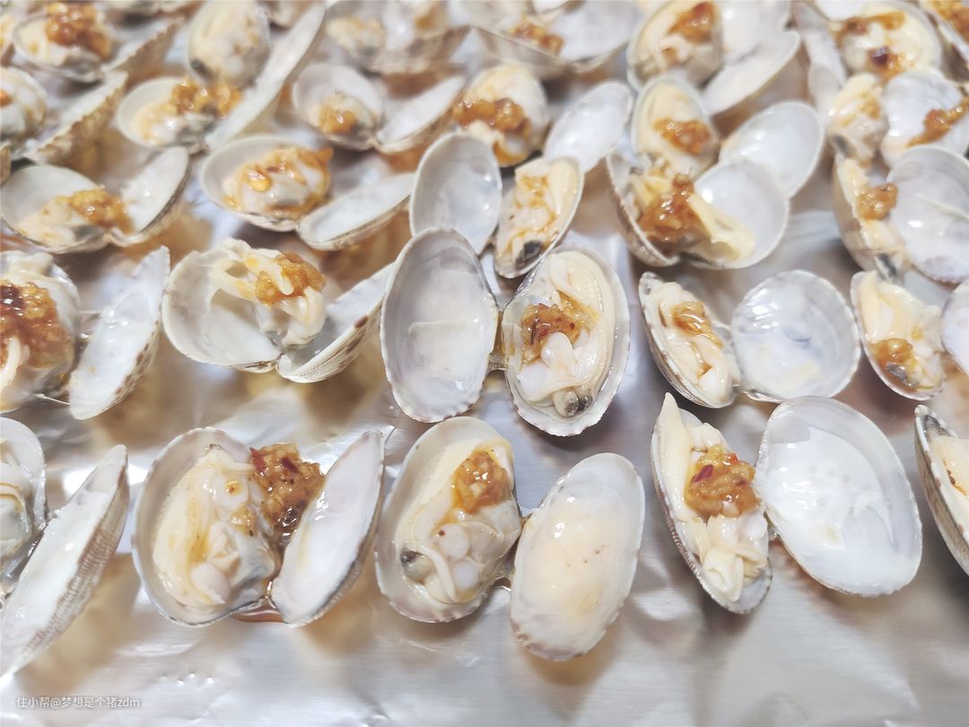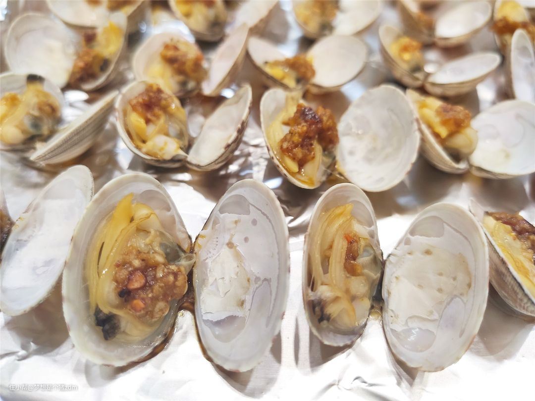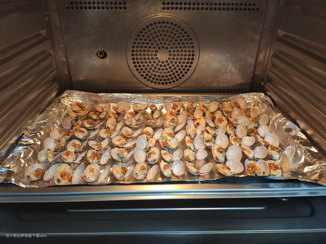 花甲用清水加铁钉养半天,然后清洗干净,下开水煮开壳;用压蒜器压出蒜蓉,加植物油、盐、生抽、蚝油、辣椒油搅拌均匀;将开壳的花甲摆放到烤盘中,然后将搅拌好的蒜蓉调料每一个花甲上放一点,设置蒸烤模式,温度180摄氏度,时间10分钟,烤花甲完成了。