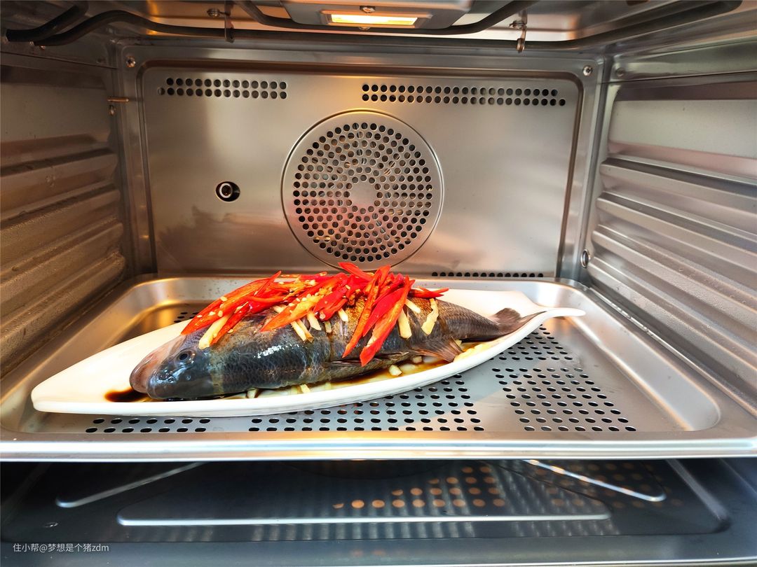 鲈鱼处理干净后,两侧脊背处各划几刀,然后用盐、生姜丝和些许料酒腌制十分钟左右;切一些红椒丝放在鲈鱼上,淋一点蒸鱼豉油,放入蒸烤箱,选择蒸汽模式,温度100摄氏度,根据鱼的大小,时间12-14分钟左右;香葱切碎,等鱼蒸好后取出,撒上香葱,将油烧热后淋到蒸好的鱼上,一道简单的清蒸鲈鱼就完成了。