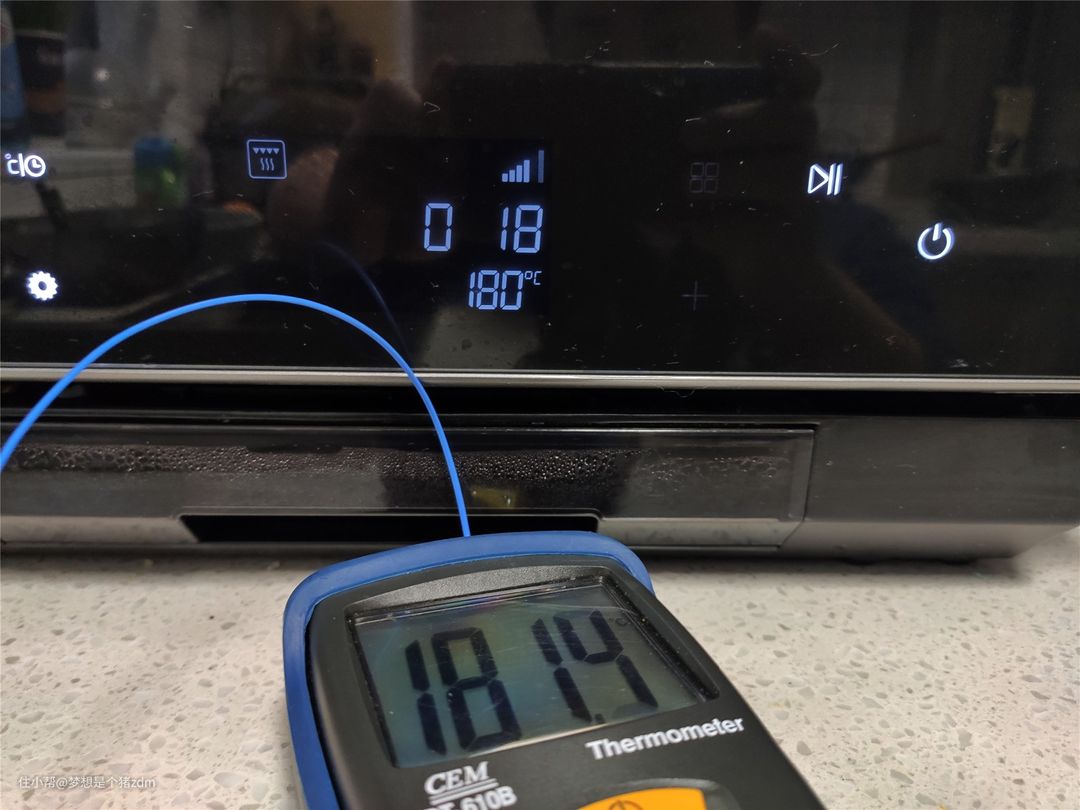 看官方介绍,这款蒸烤箱的温控系统能够将温度控制得非常准确,所以在烤鸡翅时我特地用测温设备测量了蒸烤箱内部的温度,实测的温度和设置温度非常接近。
