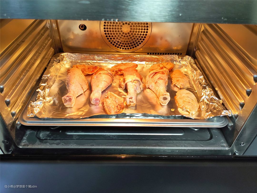 鸡翅中和琵琶腿清洗干净,表面划上两刀可以更好的入味,然后用生抽、料酒、盐、胡椒粉、孜然粉、盐焗鸡粉混合均匀后腌制,腌制时放到冰箱里冷藏12小时,然后在烤盘上垫上锡纸,将鸡翅中和琵琶腿放在烤盘上。蒸烤箱预热好后,将烤盘放入蒸烤箱,选择蒸烤模式,温度180摄氏度,时间15分钟,然后再翻一面,再烤10分钟,美味的烤鸡翅和烤鸡腿就完成了。