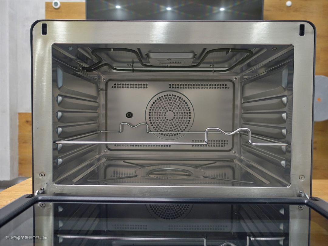 后部热风系统,电机带动循环风扇,可以将蒸烤箱内部热量均匀的分布到每一个角落。