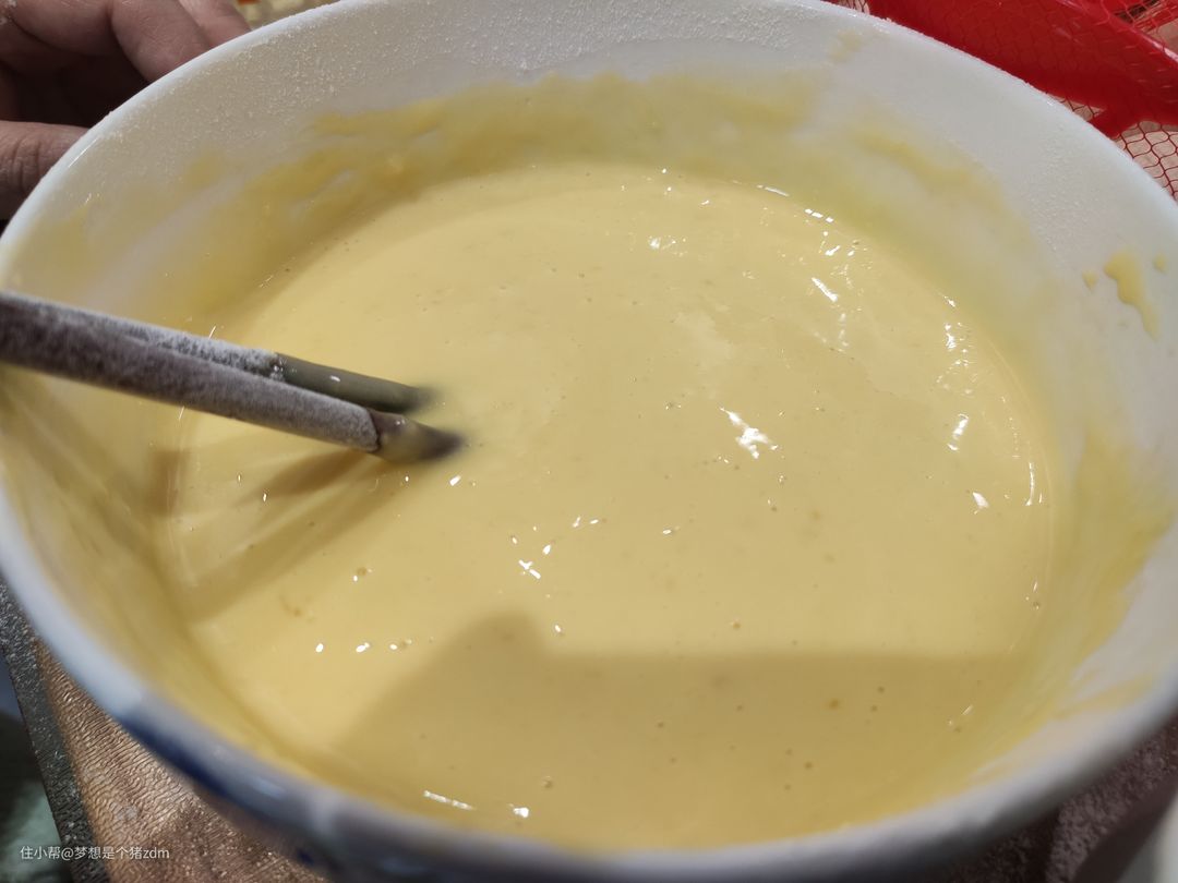 10、混合好后的状态应该是比较浓稠均匀的浅黄色。将混合好的蛋糕糊倒入模具,抹平,用手端住模具在桌上用力震两下,把内部的大气泡震出来。