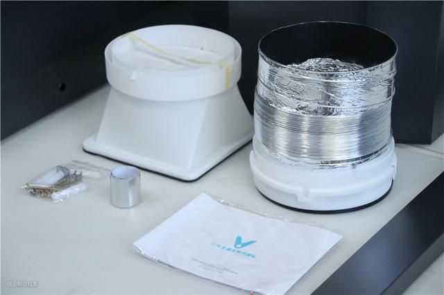先来看下附带的配件都哪些,除了主机之外,还为用户附带了1根直径为180出风管、4个(10×50mm)的膨胀管、1只出风罩、1个装饰罩、4颗木螺钉、1个装饰罩安装支架、6颗M4×8的安装螺钉、1个油杯,1个整机挂钩板和1个L形限位架,最后就是一份使用说明书了,配件还是很丰富的。