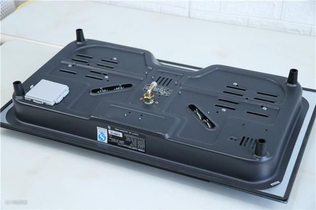 炉灶的底部是这样的,设计了多个开孔,主要也是为了散热。居中的则是燃气进气孔,右上角则是电池仓,可以看到需要两节1号电池。配件里面并没有附带,需要自行准备。炉灶的四角设计了较高的支架,即便家中没有橱柜的话,直接放在台面上也是可以使用的。