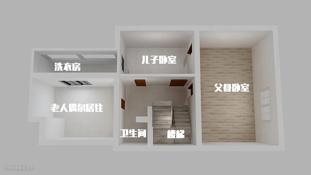 二楼空间用来居住,楼梯和过道霸占着中间很大一块地方,这么好的面积都被浪费了,导致居住空间非常拥挤。
