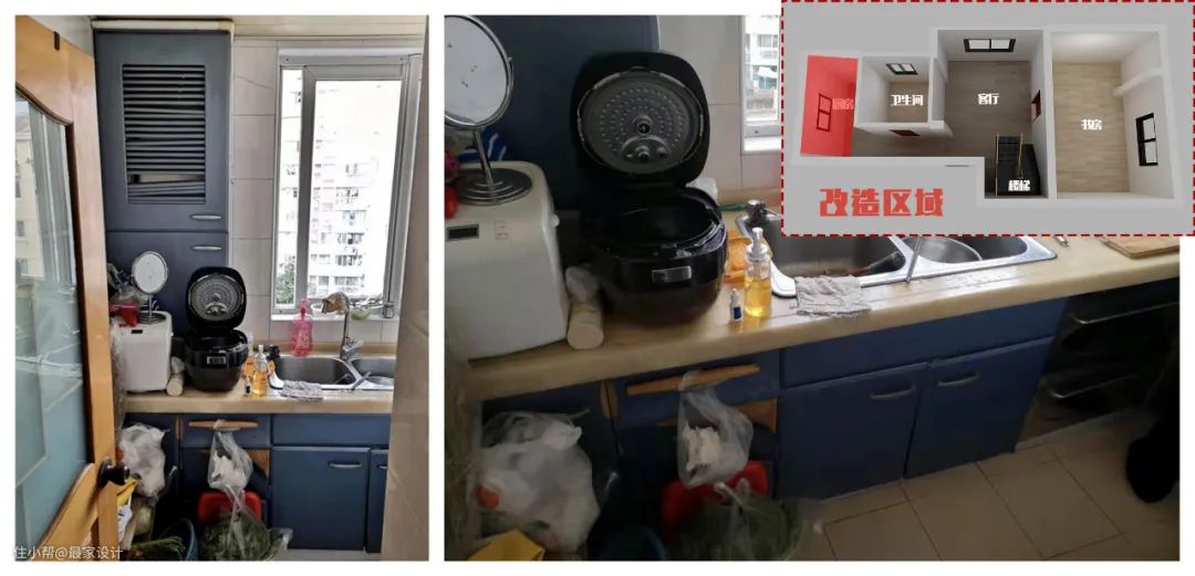 窄窄一条的厨房承担了全家吃喝重任,刘先生最头疼的就是冰箱在楼梯下面,经常会操作到一半,想到还有东西在冰箱里没拿出来,烧饭特别的不方便。由于橱柜只有下柜空间做储物,台面上堆满了锅碗瓢盆,经常会碰翻,头疼。