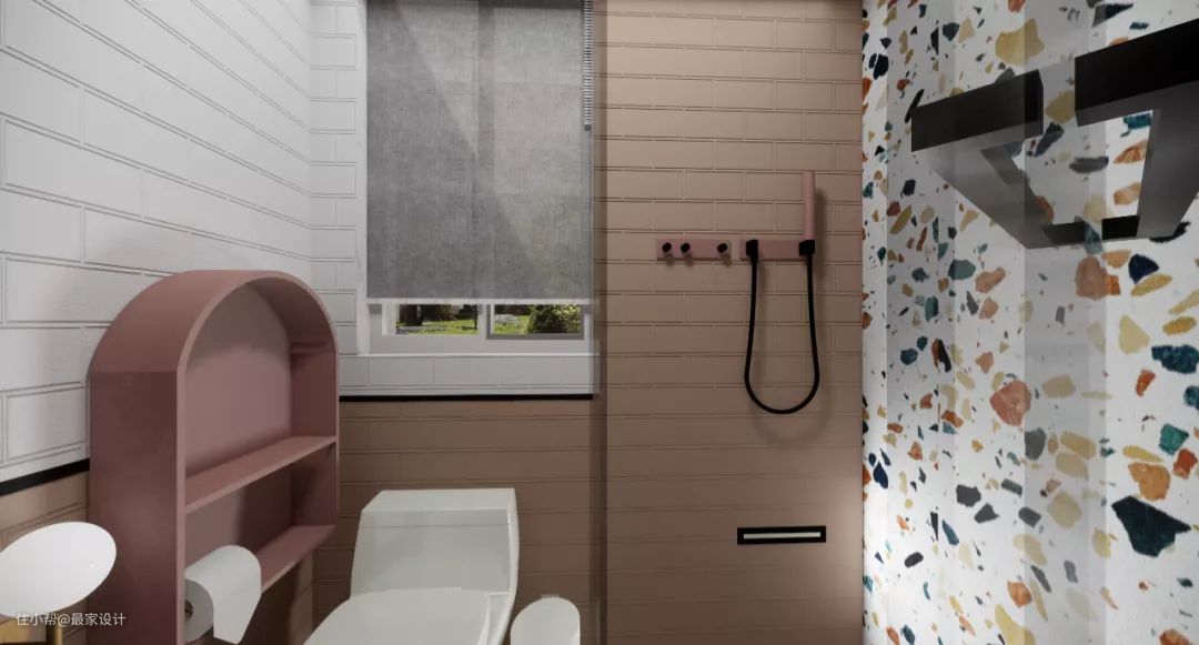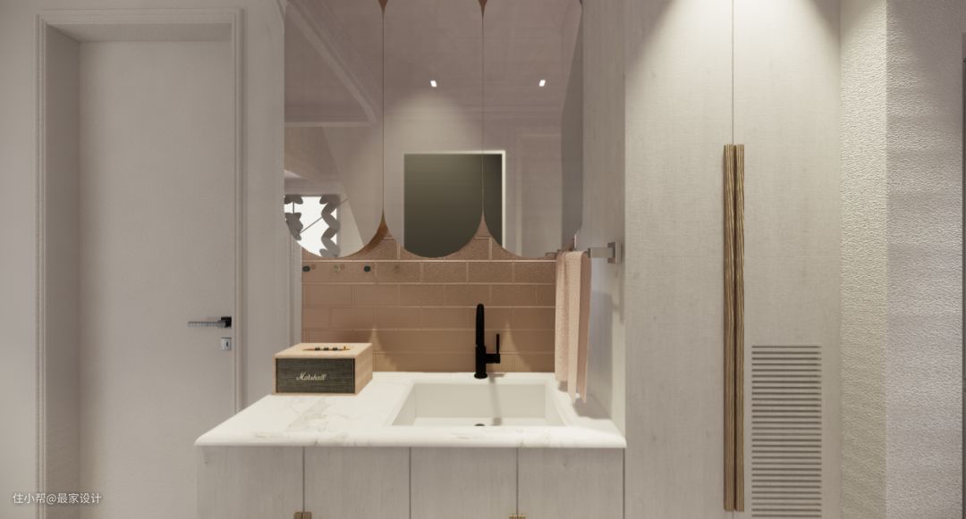把卫生间缩小,过道拓宽到1.5m,这样视觉感受就不拥挤。洗手区移到玄关能改变,三个小镜柜,下面粉色小砖,跟客卫的颜色一致,内外有个延伸。