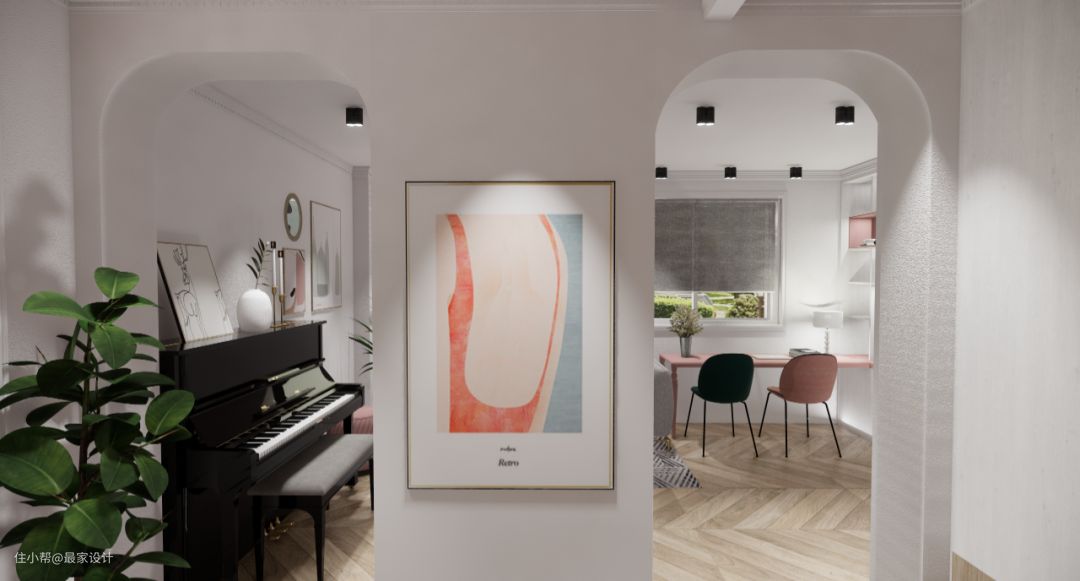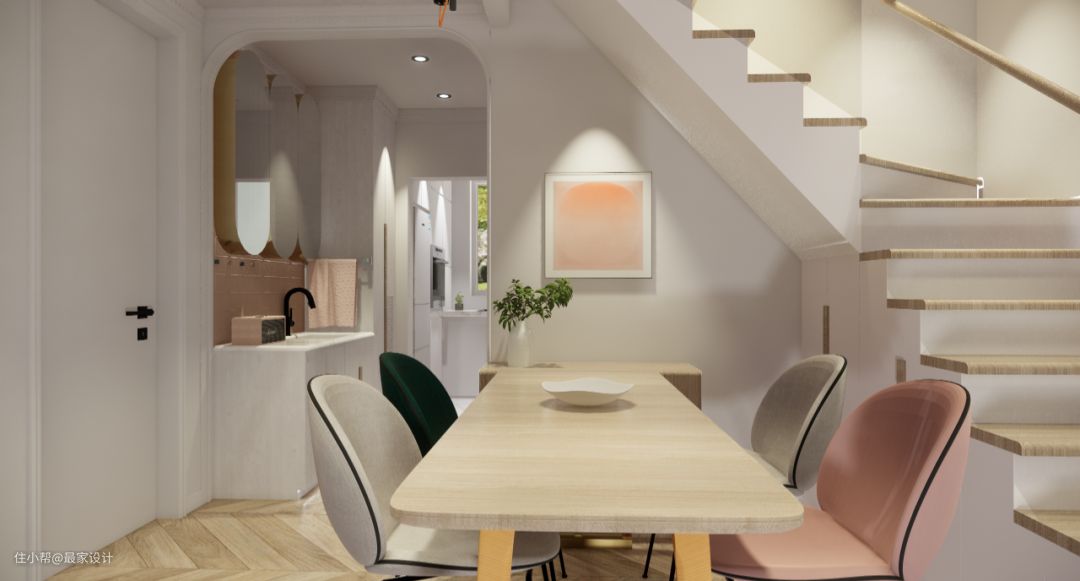 保留原来的餐厅空间,将餐厅通往客厅的墙壁打通,做成两个拱形弧线,这样一来通透性非常好,家人还有互动空间。