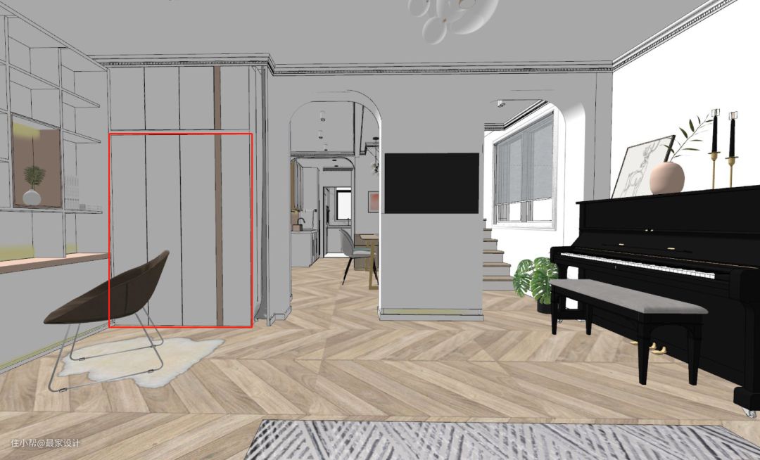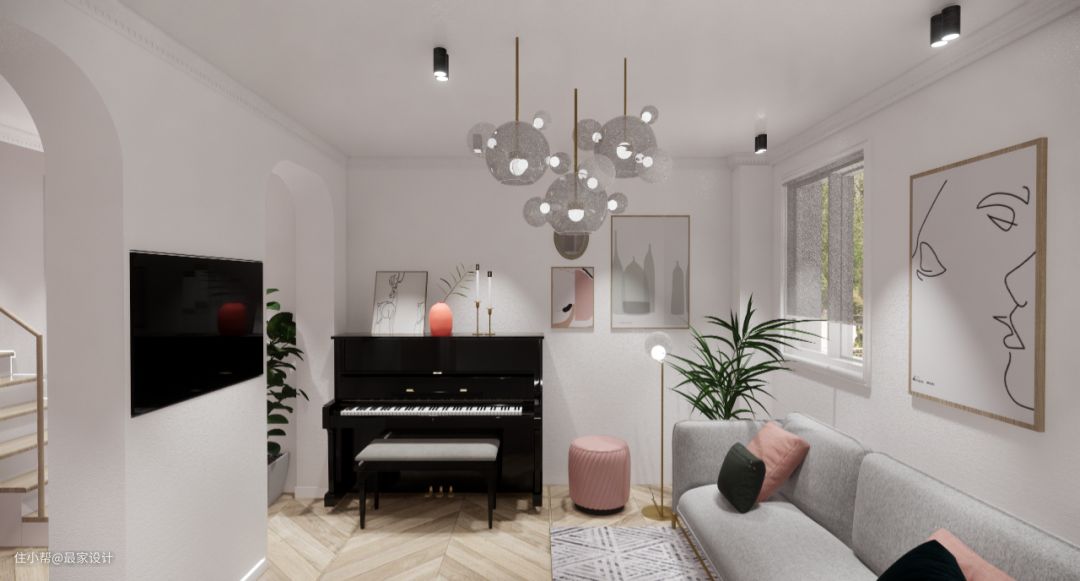 客厅的另一侧是儿子钢琴区域和观影区。一楼地板采用鱼骨拼,增加空间的层次感。