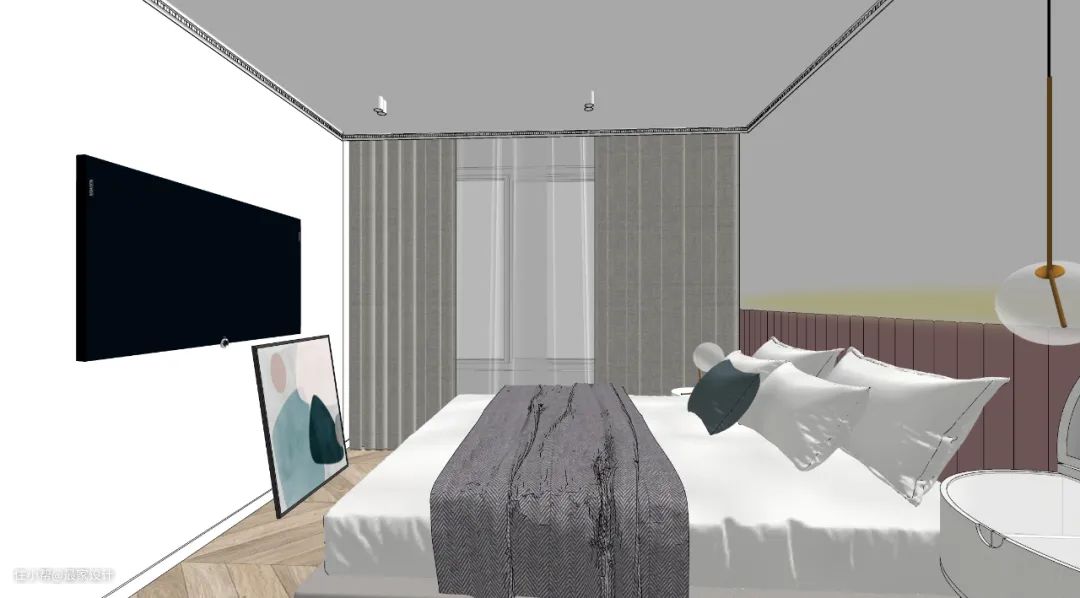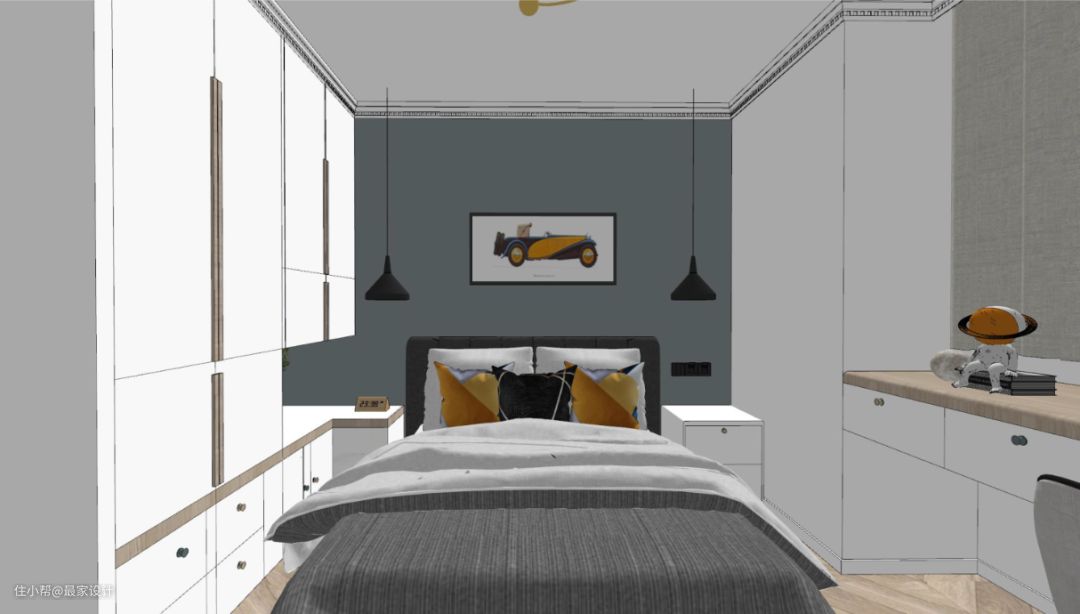 红色框框是折叠床,老人帮忙带孩子、家里来客人,可以在这里小住。床板下面做竖条形的效果,如果床板不翻下来,根本不知道这里是一个折叠床。床的上方是隐藏窗帘,有一个暗藏的轨道,可以拉个帘子起到隐私作用。