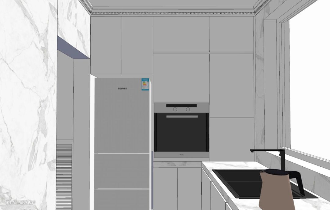 冰箱终于走进了厨房,烤箱、微波炉等家电都可以嵌入在里面。橱柜设置吊柜,可以收纳很多东西。