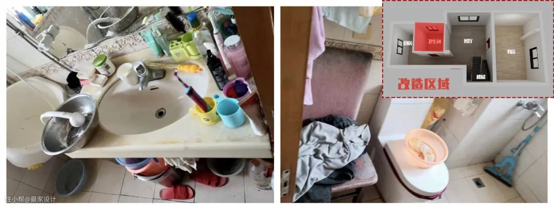 卫生间大概5㎡左右,毫无收纳功能可言,四口人的东西只能堆着、挂着、叠放着、或者摊在地上。在卫生间里,一抬头就可能会碰到毛巾、衣物,要小心又小心的避让。